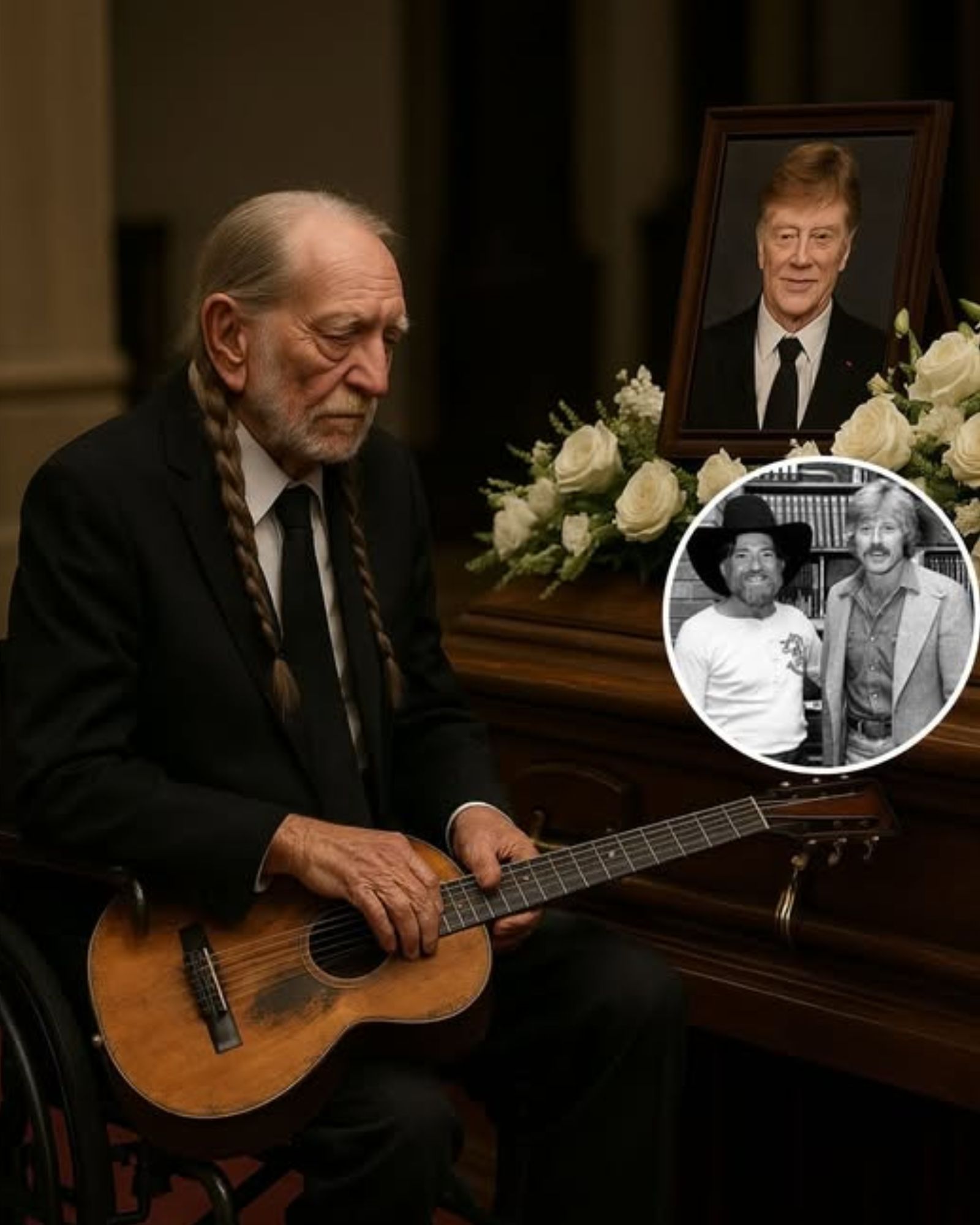 When Willie reached the casket, he paused. His calloused hands rested on the guitar, his silver hair falling softly as he bowed his head. For a long moment, he sat in silence, as though summoning not just breath but memory—gathering every shared moment, every story, every quiet admiration he had carried for the man before him.