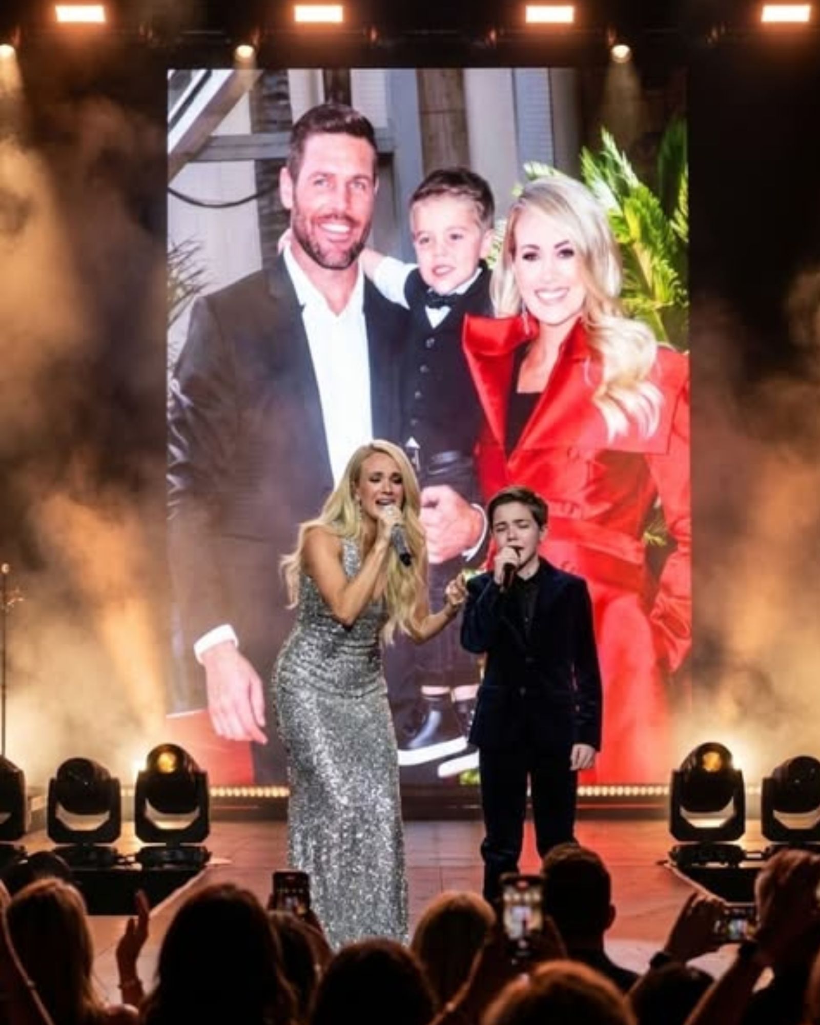 It wasn’t the stage that made this moment special. Carrie has stood on many, conquered countless. What made this night different was who stood beside her. Her son, small and wide-eyed, gripped a microphone too large for his hands, yet carried himself with a presence only innocence can bring.