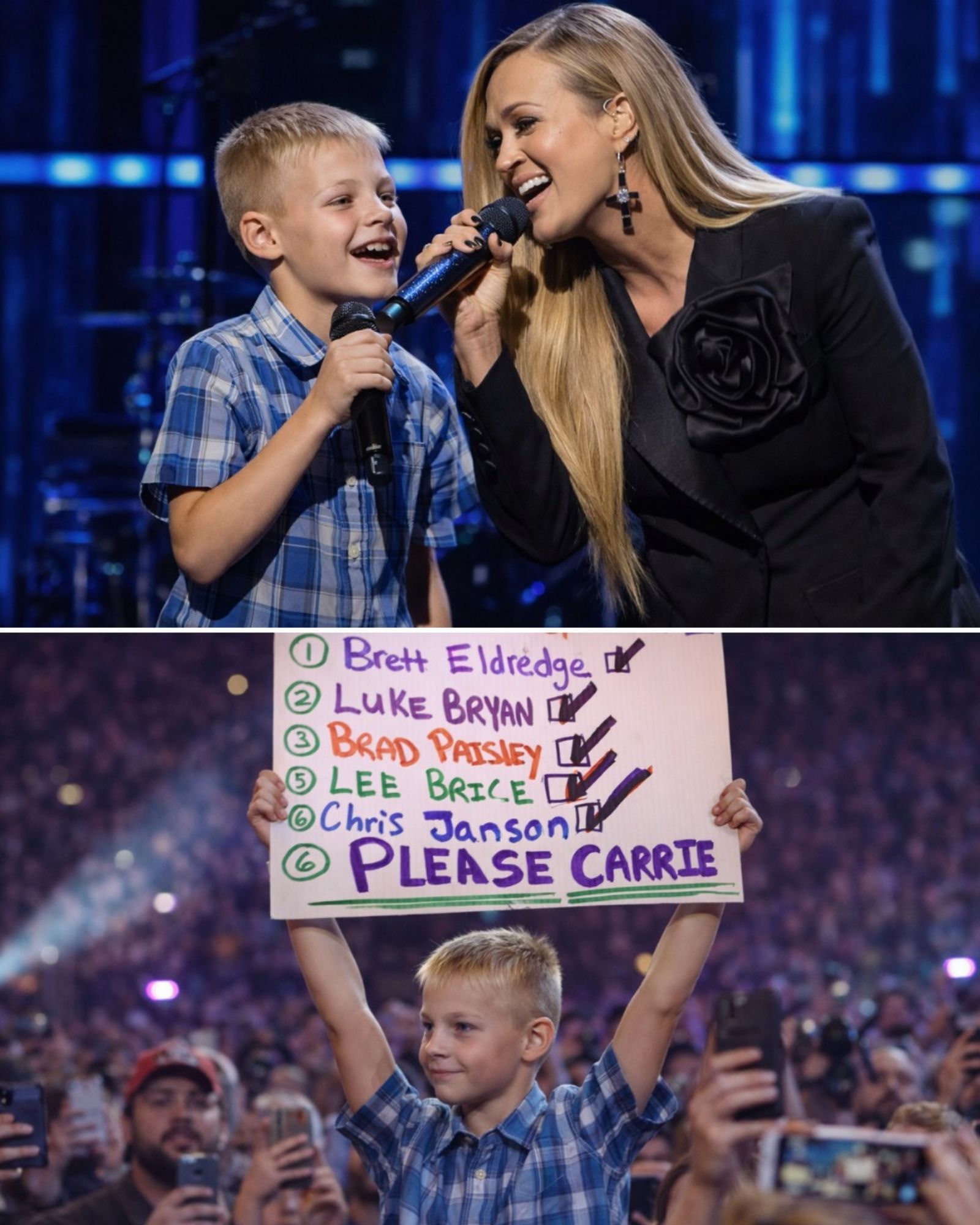 While performing at the US Bank Arena, Carrie was mid-way through her powerful song “Little Toy Guns” when a sign held by someone in the audience caught her attention. It wasn’t just any fan—it was an 11-year-old boy named Connor, who had a very special reason for being there.