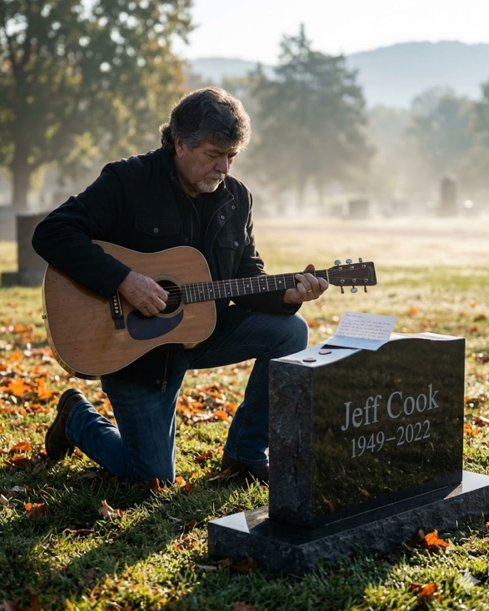 But later that morning, a cemetery caretaker noticed something resting near Jeff Cook’s stone. It was simple enough that most people might have passed it without thinking twice. A guitar pick. A folded note. Maybe a small sign that this visit had not been meant for the world at all, only for one old friend keeping a promise to another.