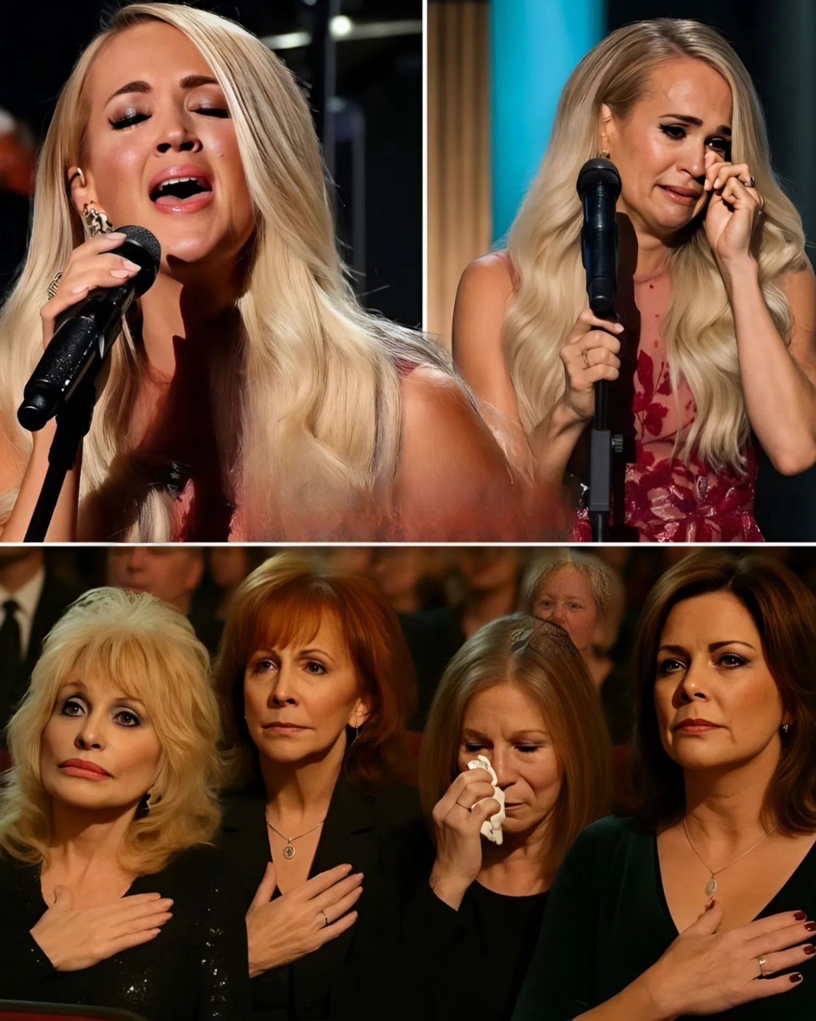 Carrie began A Broken Wing, a song forever tied to the emotional power of Martina McBride. From the first line, the air shifted. People leaned forward. Hands covered mouths. Tears appeared without permission. It wasn’t loud. It didn’t need to be. Carrie didn’t belt to prove strength—she let restraint do the work. Every phrase carried the weight of women who had stood on that stage before her, who had fought to be heard, who sang pain into purpose.