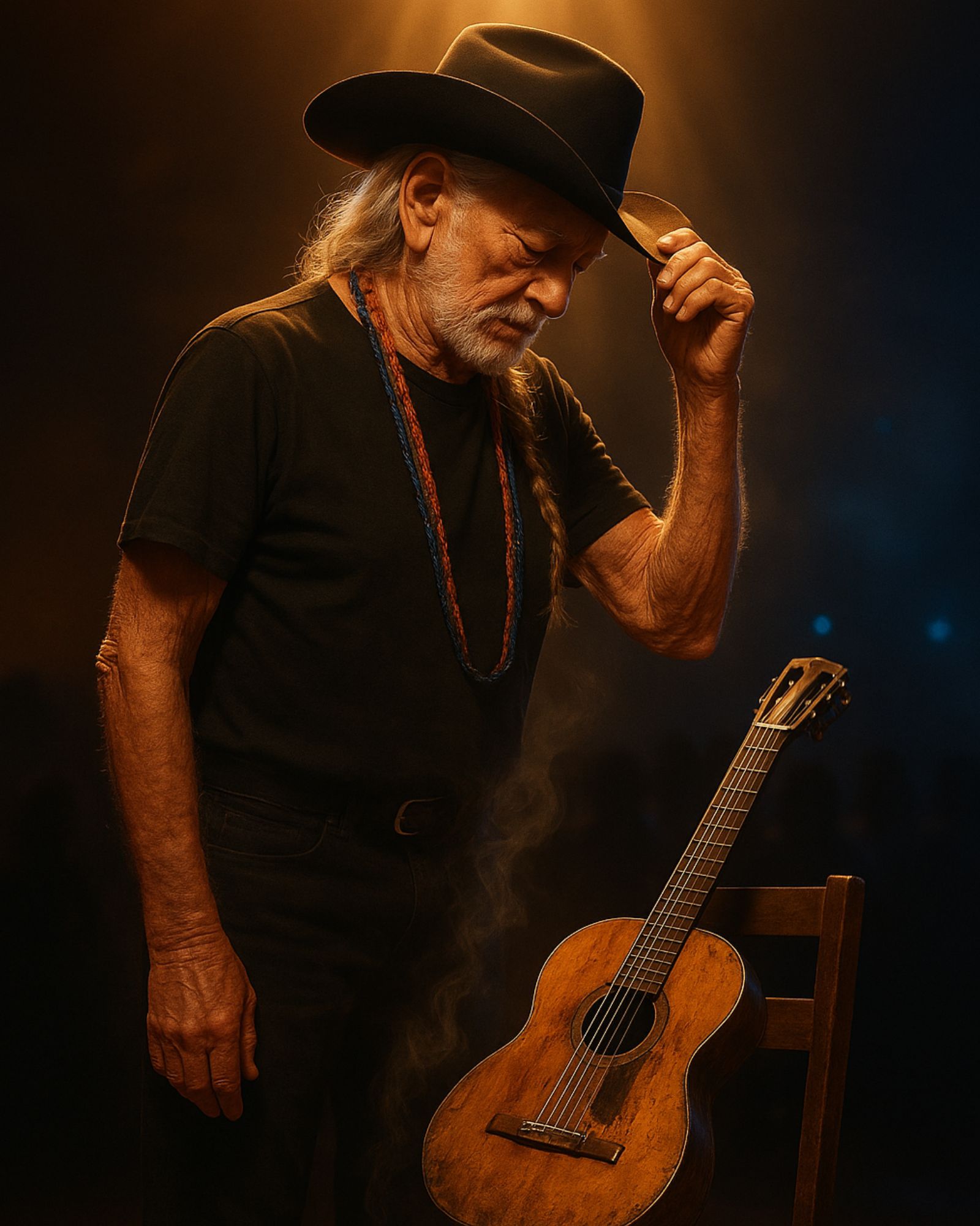 He just tipped his hat — a small, timeless gesture of gratitude — and walked away as the lights fell to gold.