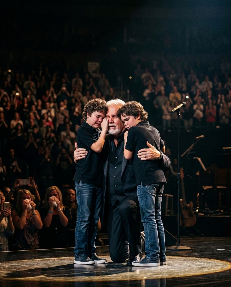 The spotlight narrowed until it seemed to hold only the three of them. One of the boys reached up and touched Kenny Rogers’ face. Kenny Rogers closed his eyes. Then Kenny Rogers wrapped both boys into an embrace that looked less like a farewell to a career and more like a promise that some things matter more than applause ever will.