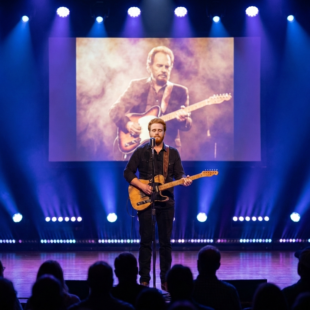 On a night that felt part concert and part quiet ritual, Ben Haggard stepped onto a stage with the Telecaster in his hands. The guitar looked exactly like a life in motion—dings along the edge, scratches near the pickguard, a body dulled by time and sweat. It did not look like something you hang on a wall. It looked like something that had been needed.