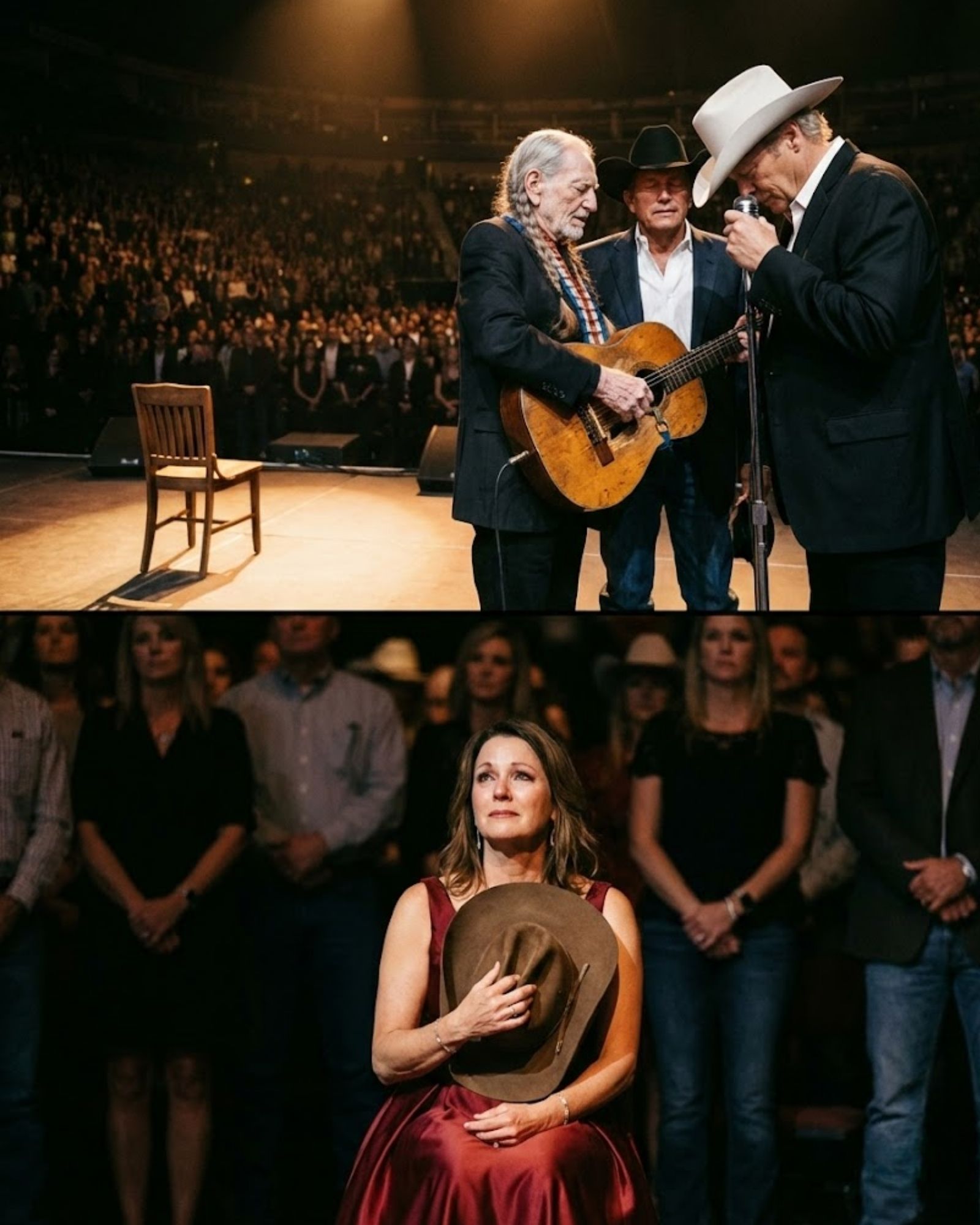 In the front row, under a soft, unmoving spotlight, an empty chair waited. In it sat his widow, small against the vastness of the room, clutching his worn cowboy hat to her chest like it might still carry his warmth. She didn’t look up when the applause faded. She didn’t need to.