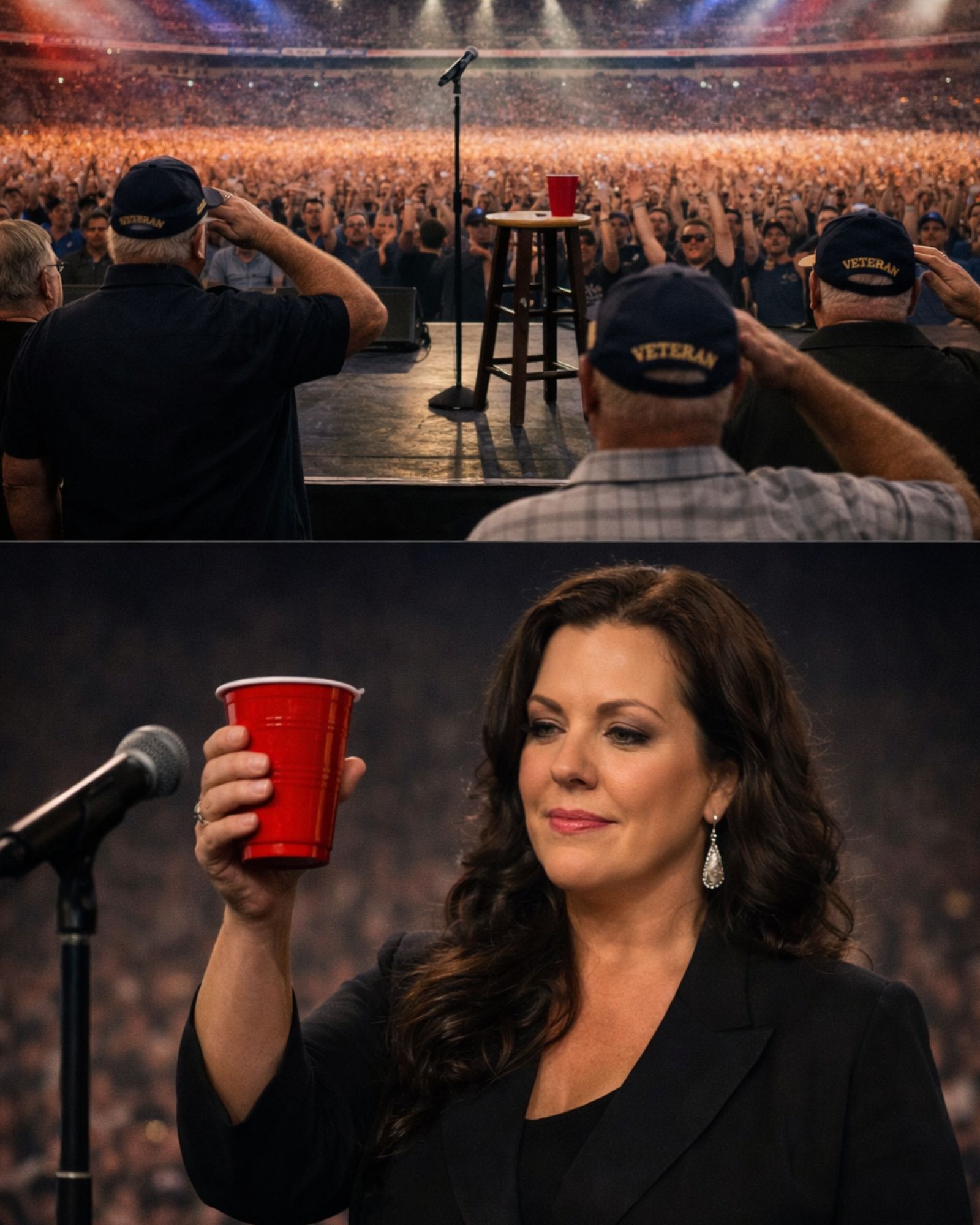 She walked to the center of the stage, placing her hand on her father’s microphone stand. She looked out at the sea of faces, took a deep breath, and picked up the red Solo cup.