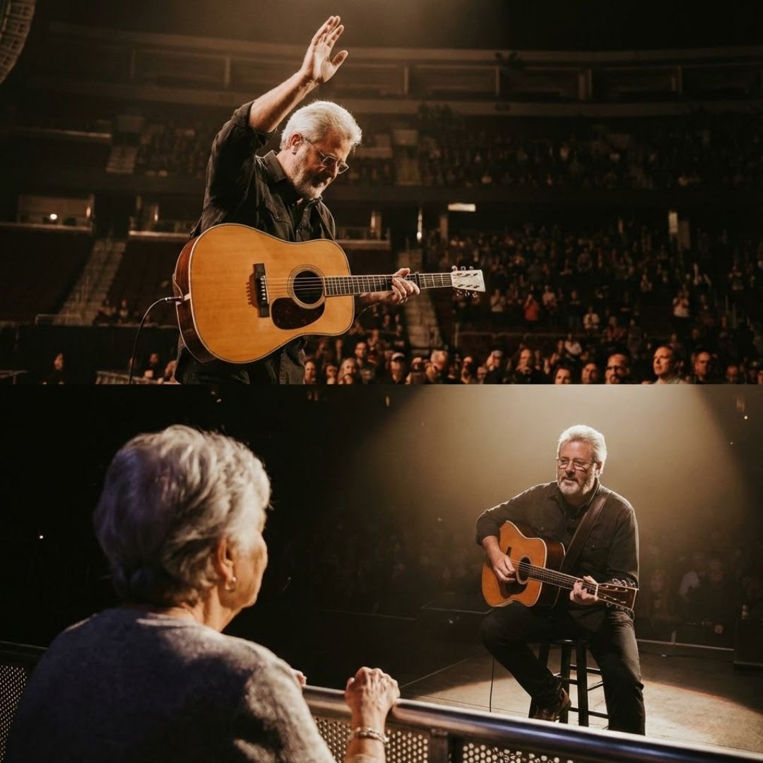 As the song came to a natural pause, Vince raised his hand. The band didn’t stop sharply. They softened. He stepped forward slightly and spoke with the same gentle tone that’s carried him through decades of music.