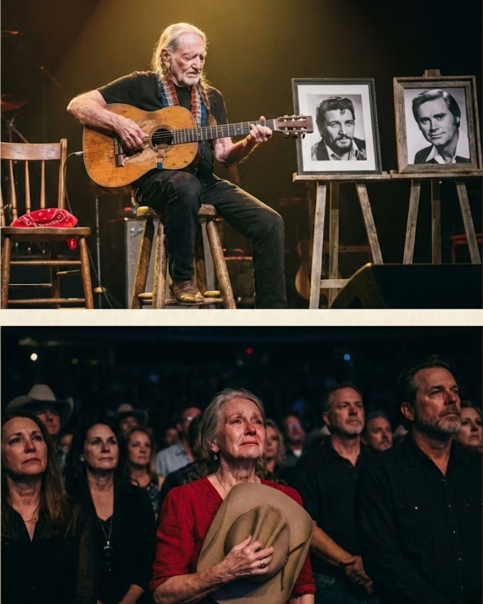 The crowd quieted down as Willie looked at the pictures. For a moment, he wasn’t a music icon playing to thousands; he was just the last surviving member of the greatest trio of troublemakers country music had ever seen.