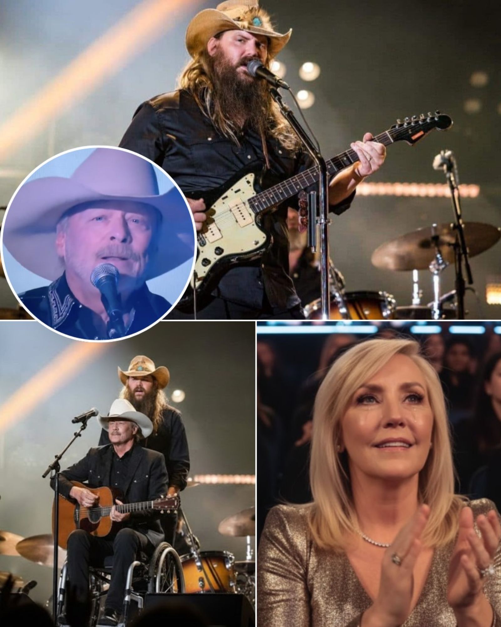 Chris Stapleton — beard, hat, and a presence as steady as a heartbeat — guided Alan toward the center of the stage with a reverence so sincere that thousands of people hardly dared to breathe. When they reached the spotlight, Stapleton leaned down and spoke softly to him, a private exchange that brought a gentle smile to Alan’s face. In that instant, the entire arena seemed to exhale as one.