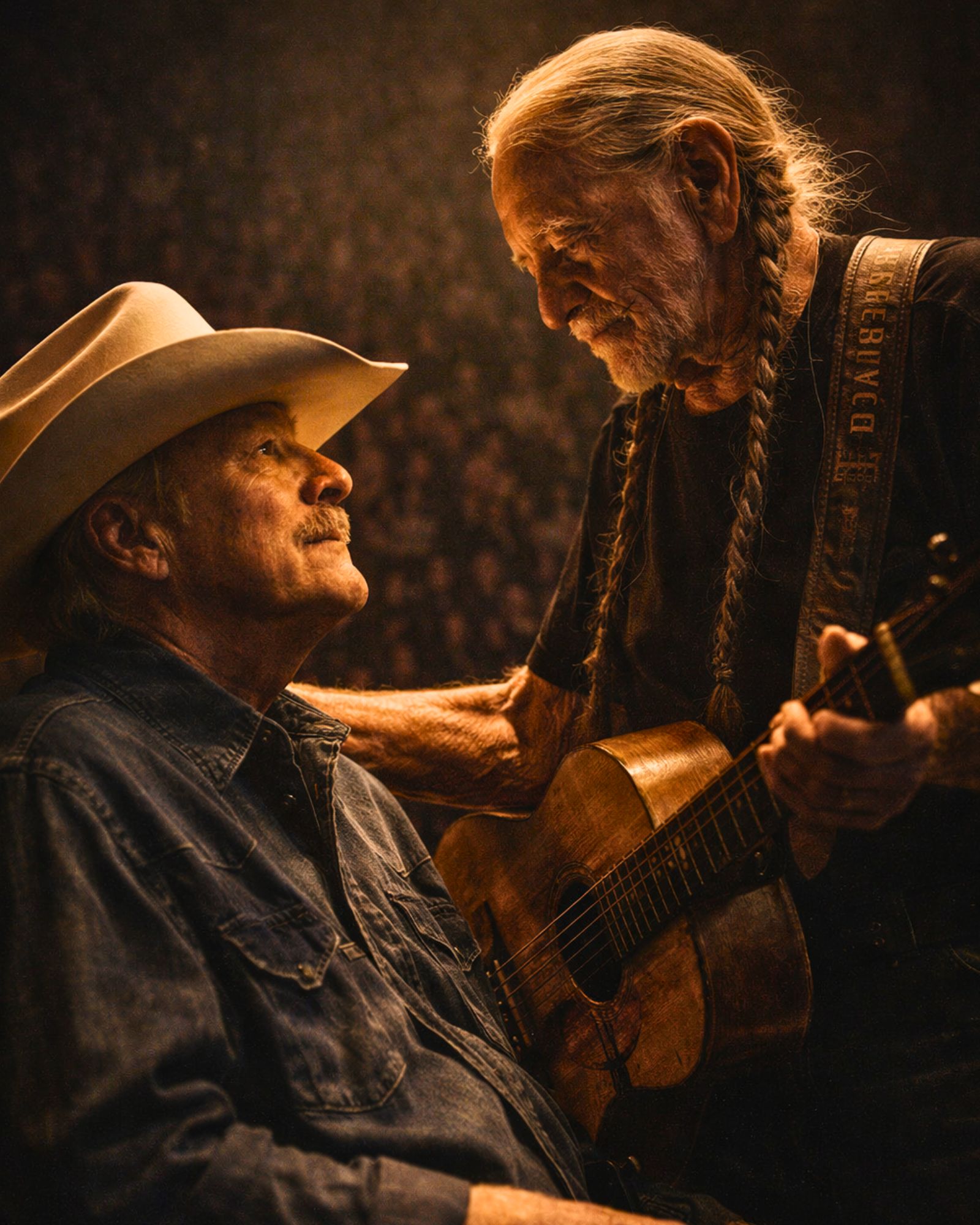 When Willie reached Alan’s side, he didn’t say a word to the crowd. He just placed a hand gently on Alan’s shoulder for a fleeting second. Two titans. Two different generations of country royalty. One spotlight.