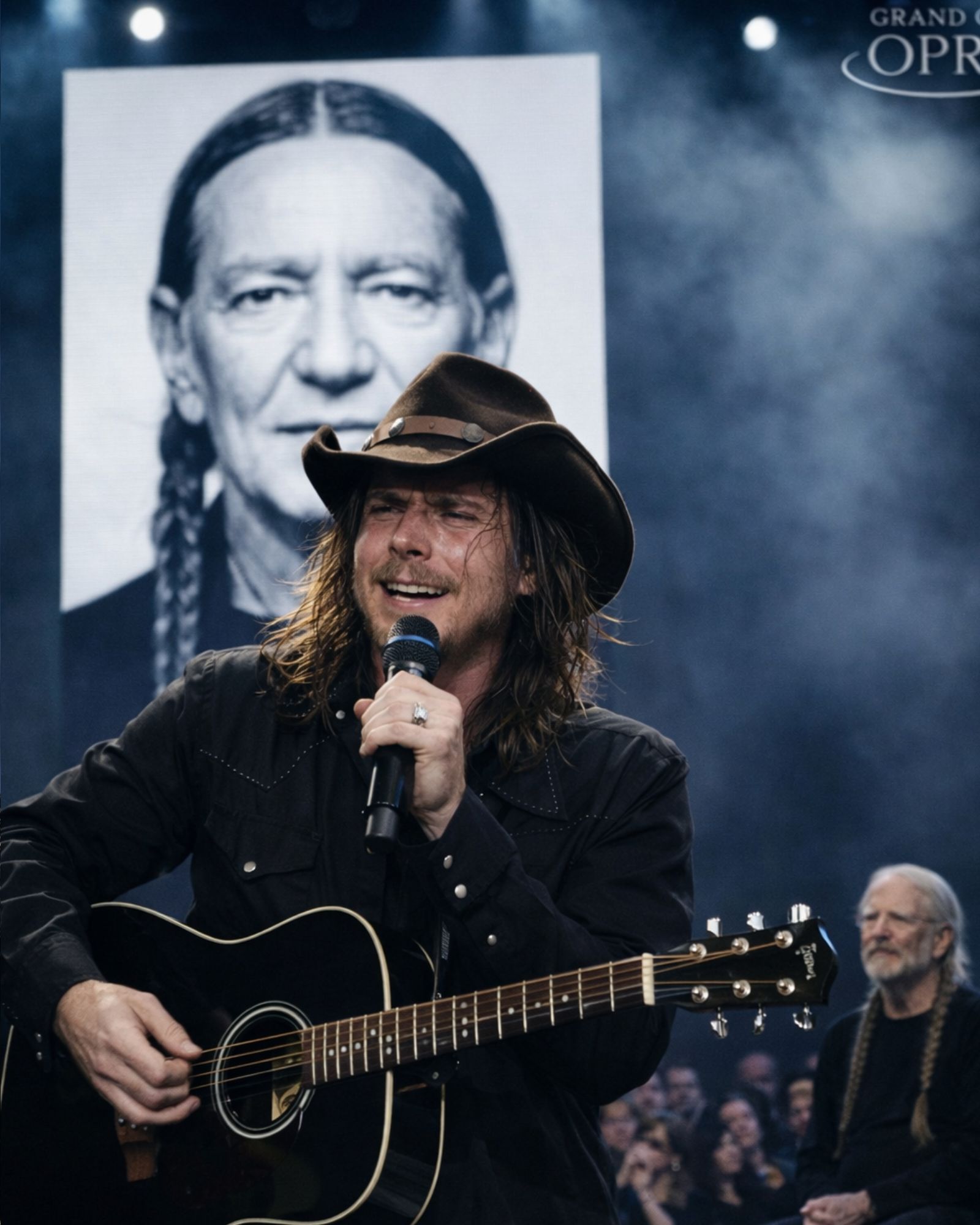 At 92, Willie Nelson did not need to command the stage to own the moment. Sometimes presence says more than performance ever could. Seated just off to the side, watching, Willie Nelson seemed less like a star waiting for applause and more like a father witnessing something he understood better than anyone else: the strange, beautiful ache of hearing your own spirit come back to you through your child.