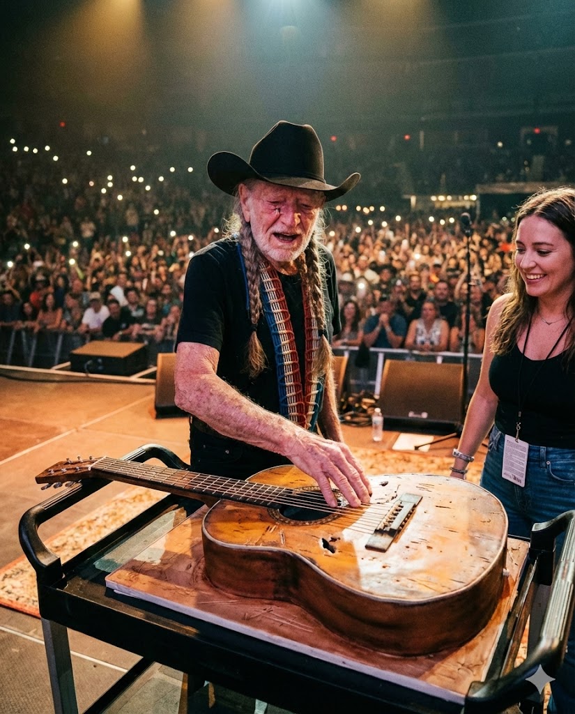 The audience gasped. It wasn’t just similar in shape—it captured every painful detail of time. Chocolate frosting had been textured to look like wood grain. Every scratch and every faded autograph on the real guitar had been recreated. And most striking of all, the cake had a dark “hole” in the exact spot Willie had worn through his real guitar over more than half a century of playing.